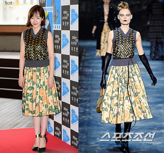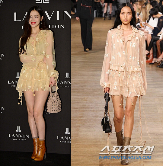 설리는 끌로에의 2015 F/W 드레스를 착용했다. 청초한 느낌의 플로럴 프린팅과 하늘하늘한 실루엣이 매력적인 드레스다. 루핑 왕은 블랙 레더 백으로 시크함을 더욱 살린 반면, 설리는 베이지 컬러의 주머니백을 배치해 여성스러운 느낌을 더욱 강조했다. 그러나 살짝 웨이브를 준 헤어스타일과 무릎 위로 올라오는 부츠를 매치한 점이 비슷하다.
