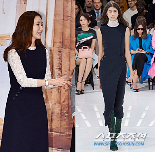 최지우는 크리스챤 디올 2015 S/S 민소매 드레스를 선보였다. 최지우와 모델 모두의 늘씬하고 우아한 바디라인을 드러내기에 좋은 아이템이다. 미카 아르가나라즈는 민소매 라인 그대로를 살려 시원하게 연출한 반면 최지우는 화이트 시스루 소재의 긴 소매 탑을 레이어드하여 여성스럽고 클래식한 느낌을 한층 살렸다.