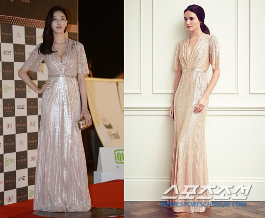 김사랑은 제니 팩햄 Resort 2015 드레스를 착용했다. 화려하게 빛나는 크리스털 장식이 눈길을 사로잡는다. 김사랑과 아만다 웨어 모두 늘씬한 바디라인을 강조했으며 심플한 액세서리로 과하지 않은 화려함을 연출했다. 그러나 모델은 묶은 헤어스타일로 우아함을 부각시킨 반면 김사랑은 한쪽으로 넘긴 헤어스타일로 섹시한 면모를 살렸다. 또한 가슴의 볼륨감이 돋보이도록 한 점이 인상적이다.