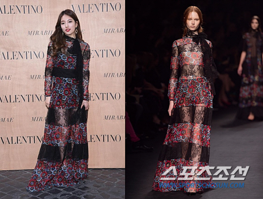수지는 발렌티노 2015 F/W 프레타포르테의 독특 원피스를 착용했다. 레드 빛의 화려한 플로럴 패턴과 블랙 시스루 재질이 스트라이프 형태로 배색되어 섹시하고 고혹적이다. 그레이스 쉬몬스는 과감하게 상체의 바디라인을 드러냈지만 수지는 이너 아이템을 착용했을 뿐 아니라한 살짝 웨이브진 헤어스타일과 빅 이어링으로 화려함을 더욱 강조했다.
