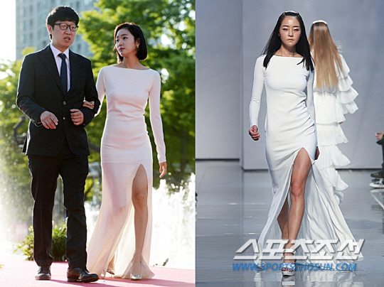 김고은은 아르케의 2015 S/S 화이트 드레스를 선택했다. 여성스러운 곡선을 강조할 뿐 아니라 절개 디테일의 스커트로 은근한 섹시함을 전하는 의상이다. 깔끔한 실루엣의 의상인 만큼 헤어스타일에서의 차이가 두드러지는데, 강승현은 어깨를 넘는 머리길이로 모던함을 살린 반면 김고은은 단발머리로 성숙하고 부드러운 느낌을 강조했다.