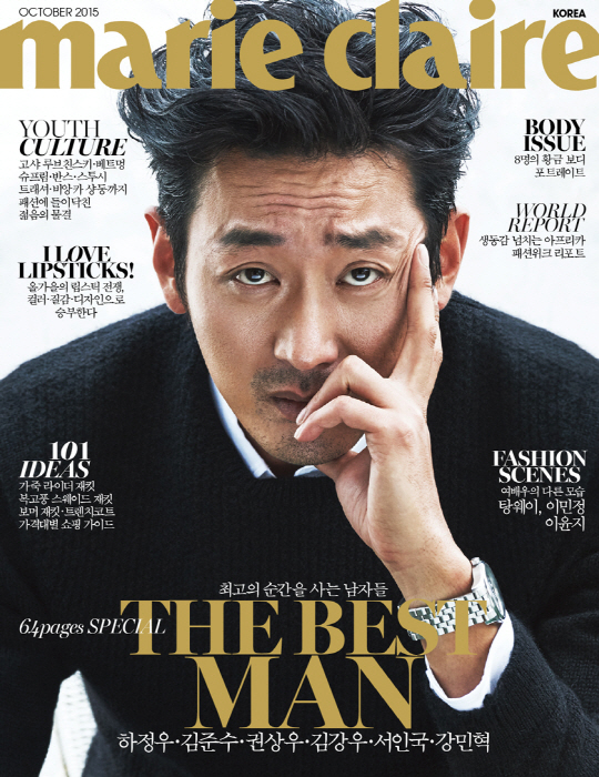 18일 공개된 패션 매거진 '마리끌레르' 10월호의 커버는 최근 영화 '암살'을 통해 '1000만 배우'라는 타이틀을 거머쥐며, 관객들이 믿고 보는 배우임을 다시금 증명한 하정우가 장식했다.