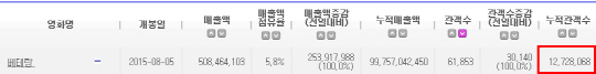 '베테랑'은 안하무인 유아독존 재벌 3세를 쫓는 베테랑 광역수사대의 활약을 그린 범죄오락액션이다. 개봉 3일째 100만, 4일째 200만, 6일째 300만, 9일째 400만, 10일째 500만, 12일째 600만, 14일째 700만, 18일째 800만, 19일째 900만, 25일째 1,000만, 28일째 1,100만, 35일째 1,200만 관객을 돌파한 영화 '베테랑'이 9월 19일(토)까지 누적 관객 12,728,068명 관객을 기록했다.