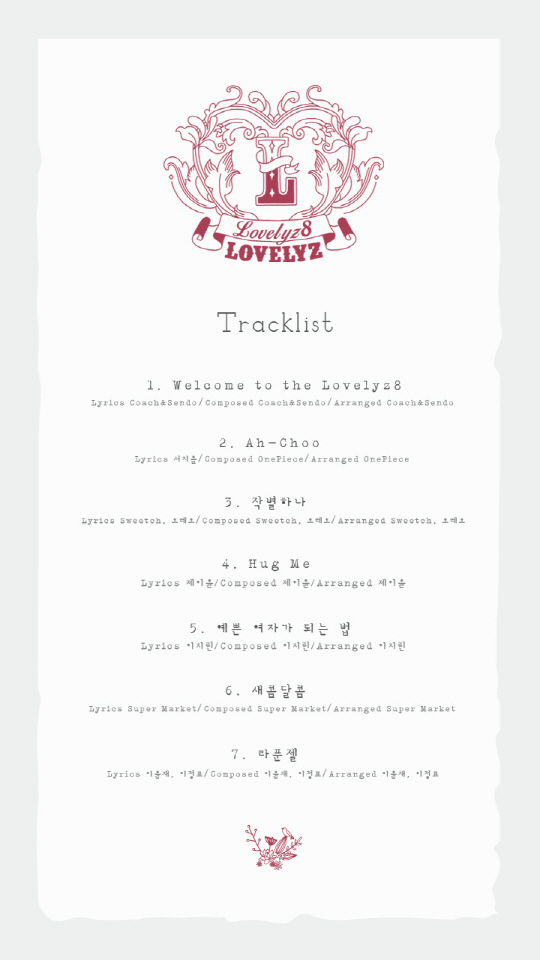 21일 자정 소속사 울림엔터테인먼트는 러블리즈의 공식 홈페이지(www.lvlz8.com)와 SNS 채널을 통해 미니앨범'lovelyz8'의 전곡 트랙리스트 이미지를 공개했다. 공개된 트랙리스트 이미지 속에는 최강 작사.작곡가 라인업을 공개해 앨범에 대한 기대감을 한껏 높였다.