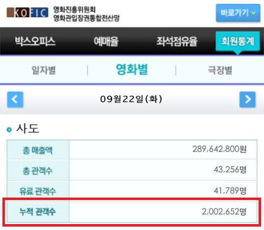 압도적인 몰입감과 뜨거운 울림으로 역대급 정통사극의 탄생을 알린 영화 '사도'가 개봉 4일째 100만 관객을 동원한 것에 이어 개봉 7일째인 200만 관객을 넘어섰다. '사도'의 200만 돌파 속도는 올해 최고의 스코어를 기록한 '국제시장'과 2012년 추석 시즌 개봉해 천만 관객을 동원한 '광해, 왕이 된 남자'보다 하루 빠른 기록으로 추석 연휴를 앞두고 본격적으로 흥행 질주를 시작한 '사도'의 흥행 행보에 귀추가 주목된다.