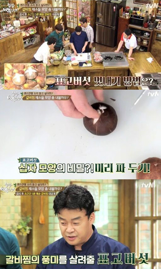 이어 백종원은 "표고버섯의 칼집은 저절로 벌어지는 게 아니다. 십자 모양으로 미리 파두는 것"이라고 강조하며 시범을 보였다.