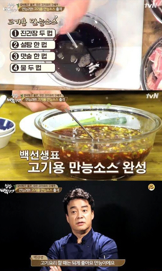 고기용 만능소스' 레시피는 진간장 두 컵과 설탕 한 컵, 맛술 한 컵, 물 두 컵, 간 마늘 반 컵, 다진 생강 한 숟갈, 파 한 컵, 참기름 3분의 1컵이다. 이를 살짝 맛 본 송재림-윤상 등 제자들은 "그냥 갈비양념 같다"라며 극찬했다.