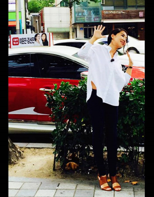 공개한 사진에는 tvN '현장토크쇼 택시'의 택시 앞에서 두 손을 들고 포즈를 취하고 있는 모습이다. 특히 두 아이 엄마답지 않은 늘씬한 몸매와 연예인 뺨치는 청순한 외모가 시선을 사로잡는다.
