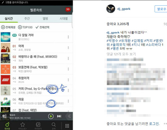 순위에는 유재환이 투개월의 김예림과 부른 '커피'가 가수 아이유와 MBC '무한도전' 2015 영동고속도로 가요제에서 부른 박명수의 '레옹'보다 앞서고 있는 것. 특히 박명수는 유재환의 노래에 자신의 이름을 표시하며 '승'이라는 글자를 넣어 재치를 더했다.