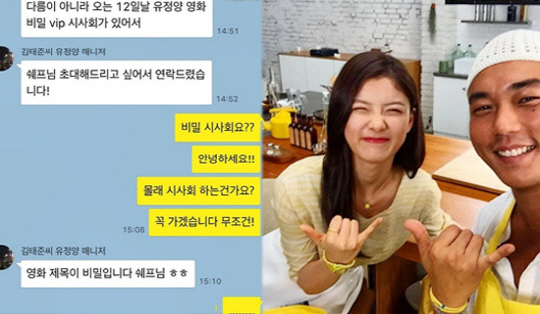 이어 그는 "다름이 아니라 오는 12일날 유정양 영화 비밀 VIP 시사회가 있어서 쉐프님 초대해드리고 싶어서 연락드렸습니다"며 영화 '비밀' VIP 시사회에 초대했다.