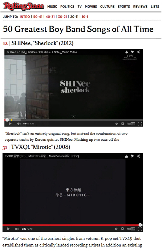 미국 유명 매체 롤링스톤지는 24일(현지시각) 전세계 보이밴드들이 현재까지 발표한 곡 중 최고 50곡을 뽑은 '역대 최고의 보이밴드송 50'을 발표했다. 이 명단에는 샤이니가 2012년 발표한 미니5집 타이틀곡 '셜록'과 동방신기가 2008년 발표한 정규4집 타이틀곡 '주문'이 이름을 올렸다. 이번 명단에는 샤이니와 동방신기 외에 백스트리트 보이즈, 엔싱크, 원디렉션, 뉴키즈온더블록, 잭슨파이브, 몽키스 등 전세계 최고 보이 밴드들의 곡이 선정돼 샤이니와 동방신기의 글로벌한 파워를 입증했다.