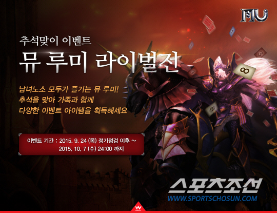 MMORPG '뮤 온라인'과 '뮤 블루'에선 10월 7일까지 '뮤 루미 라이벌전'을 진행한다. '뮤 루미'는 몬스터를 사냥해 수집한 숫자 카드 조각으로 정해진 카드의 짝을 맞추는 미니 게임이다. 회원들은 획득한 루미 점수에 따라 '보석'과 '펜타그램' 등 게임 아이템을 획득할 수 있으며, 각 서버별로 높은 점수를 획득한 회원들에게 '3차 행운날개'와 '광휘의 에르텔' 등 최상급 아이템을 지급한다. 이벤트는 뮤 온라인 테스트 서버-뮤 블루 아이스 서버를 제외한 전 서버 회원들이 참여할 수 있다. 또 10월 1일까지 '뮤 온라인'과 '뮤 블루' 전 서버에서 몬스터 사냥 시 경험치 30%가 상승하며 몬스터 체력도 20% 감소되어 사냥의 재미를 경험할 수 있다.