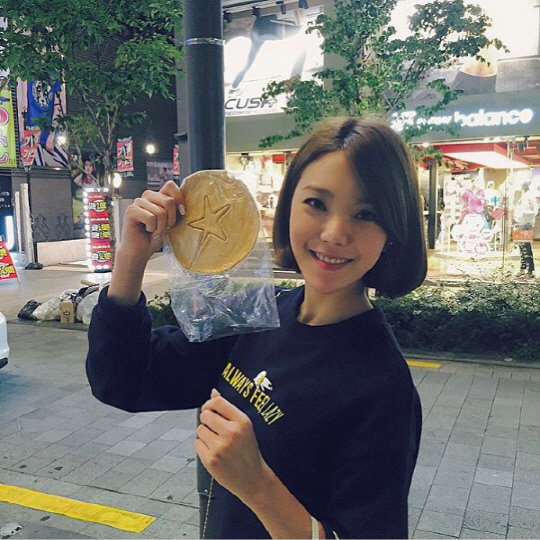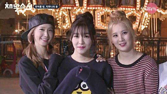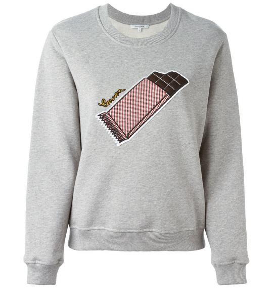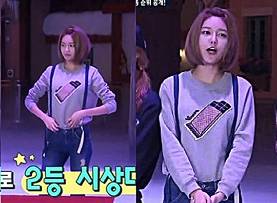 수영의 먹다 남긴 초콜릿 맨투맨 소녀시대 수영의 맨투맨은 다른 소녀들과는 달리 음식 캐릭터가 그려져 있어요. 누가 한 입 베어먹은 것 같은 초콜릿 프린팅이 재미있습니다. 멜빵 데님 팬츠와 앞머리를 올려 묶은 사과 헤어스타일까지 함께하니 더욱 더 발랄합니다. 달달한 간식이 먹고 싶은 그런 날 착용하면 좋을 것 같네요. 까르벵의 제품입니다.