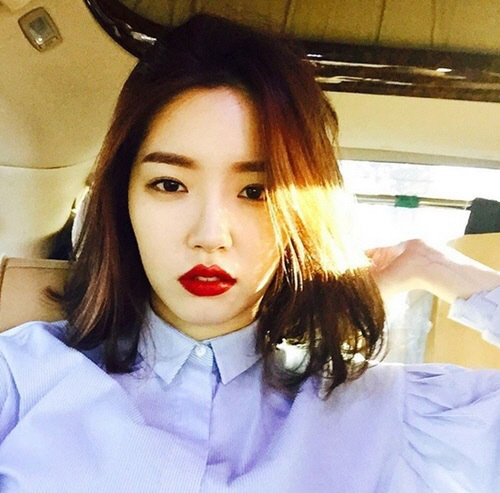 김새롬은 푸른빛의 블라우스를 입고 하얀 피부를 돋보이게 하는 새빨간 립스틱으로 눈부신 미모를 과시했다.