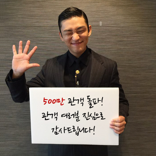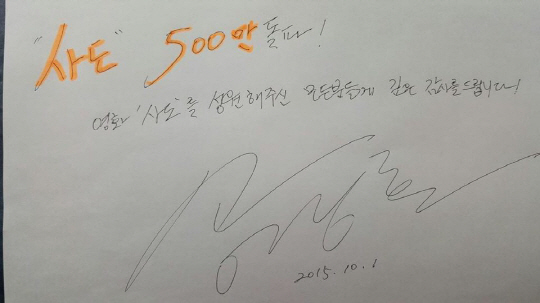 '사도'는 어떤 순간에도 왕이어야 했던 아버지 '영조'와 단 한 순간이라도 아들이고 싶었던 세자 '사도', 역사에 기록된 가장 비극적인 가족사를 담아낸 이야기. 압도적인 몰입감과 뜨거운 울림으로 역대급 정통사극의 탄생을 알린 영화 '사도'가 개봉 4일째 100만, 개봉 7일째 200만, 개봉 11일째 300만, 개봉 13일째 400만 관객을 동원한 것에 이어 개봉 16일째인 1일 오전 11시 20분 500만 관객을 돌파했다. '영조'를 연기한 송강호는 "사도 500만 돌파! 성원해주신 모든 분들께 깊은 감사를 드립니다"라는 친필 메시지를, 유아인은 익살스러운 표정과 함께 손가락으로 500만의 '5'를 표현하며 "500만 관객 돌파! 관객 여러분 진심으로 감사 드립니다"라는 메시지를 담은 인증샷을 전해 기쁨의 순간을 만끽했다.