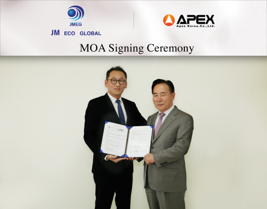 ◇㈜JM에코글로벌 박준태 대표와 에이펙스코리아 전진환 대표가 MOU를 맺은 뒤 기념촬영을 하고 있다. 사진제공=JM에코글로벌