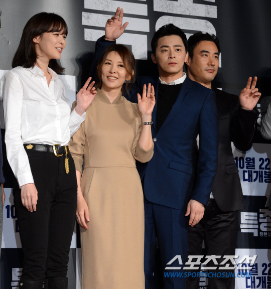 지난 달 23일 영화 '특종: 량첸살인기' 제작보고회에서 이하나 이미숙 조정석 배성우(왼쪽부터)가 포즈를 취하고 있다. 허상욱 기자 wook@sportschosun.com