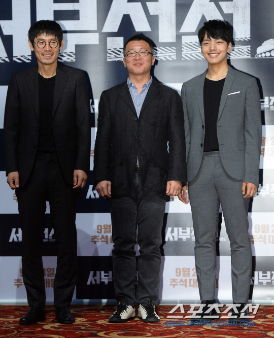 지난 달 15일 영화 '서부전선'의 언론시사회에서 포즈를 취하고 있는 설경구 천성일 감독 여진구(왼쪽부터). 최문영 기자 deer@sportschosun.com