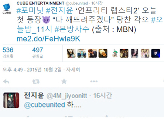 한편 큐브 엔터테인먼트는 이날 방송에 앞서 공식 SNS를 통해 "포미닛 전지윤 언프리티랩스타2 오늘 첫 등장 '다 깨뜨려주겠다' 당찬 각오"라며 출연 소식을 전했다. 하지만 전지윤은 자신의 SNS를 통해 "하…"라며 복잡한 심경을 토로했다.