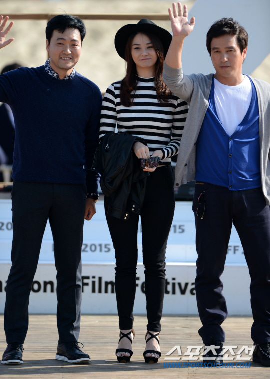 조재현 감독과 배우 윤주, 이준혁 3일 부산 해운대 비프빌리지에서 진행된 영화 '나홀로 휴가' 무대인사에 참석해 포즈를 취하고 있다. 조재현의 감독 데뷔작