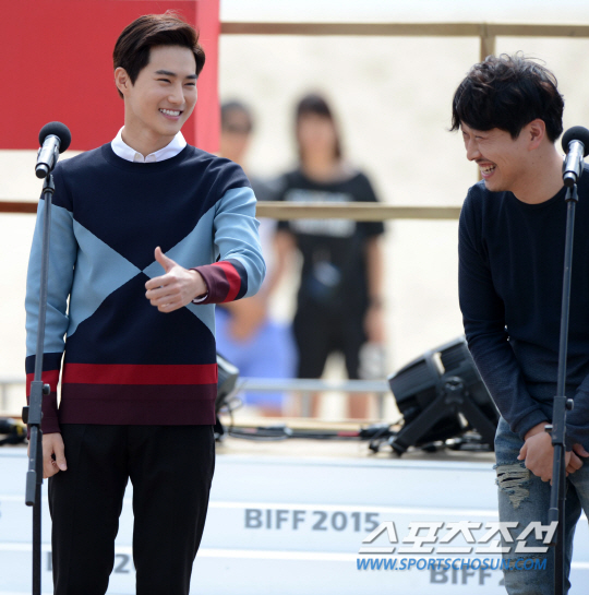 수호와 최정열 감독이 4일 부산 해운대 비프빌리지에서 진행된 영화 '글로리데이' 스페셜 무대인사에 참석해 인사를 하고 있다. 부산=허상욱 기자 wook@sportschosun.com/2015.10.04/