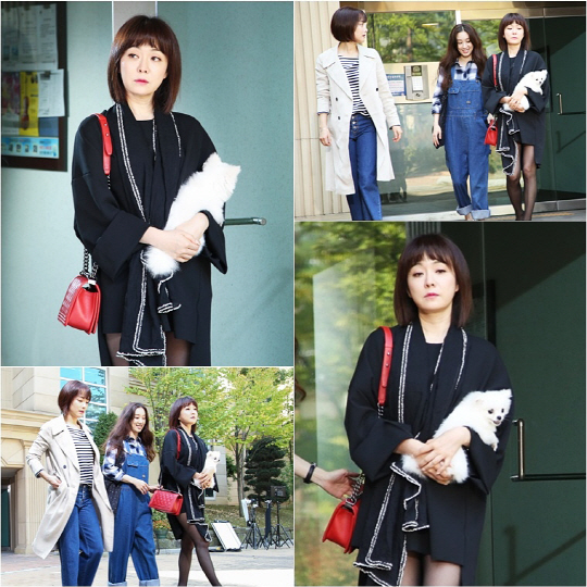무엇보다 김정난이 웃음기 하나 없는 얼굴로 머리부터 발끝까지 시크한 '올 블랙 패션'을 갖춰 입은 채 등장한, 포스 가득한 현장이 공개돼 시선을 집중시키고 있다. 차가운 매력을 드러내는 일명 '클레오파트라 단발'을 한 채 강아지를 품에 안고 도도한 걸음을 옮기는 모습이 눈길을 사로잡고 있는 것.