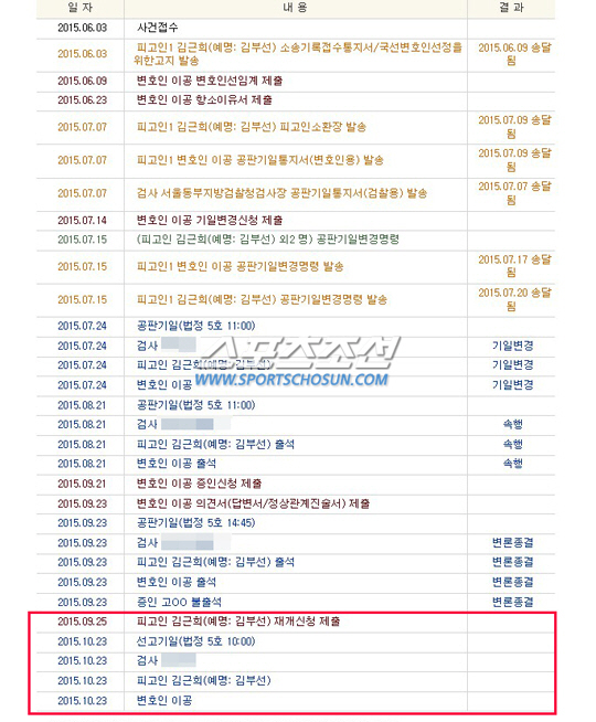 김부선씨 명예훼손 항소심 사건진행내역. 사진제공=이공