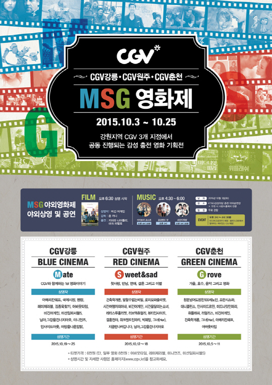 CGV는 5일부터 25일까지 3주간 CGV춘천, 강릉, 원주에서 '10월의 MSG 영화제'를 순차적으로 개최한다고 밝혔다. MSG영화제는 '동행(Mate)','달콤함(Sweet)&슬픔(Sad)', '그린 힐링(Green Healing)'을 테마로, 인기리 상영작을 한 데 모아 재상영하는 특별전이다. 특히 지역 주민들이 영화제를 통해 좀 더 다양한 영화를 즐길 수 있도록 대부분의 상영작은 6천원에 제공된다.