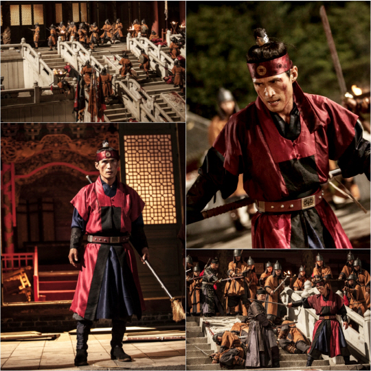 10월 6일 제작진이 공개한 사진 속 정두홍은 군사들에게 둘러싸여 있다. 그 안에서 정두홍은 검을 들고 누군가의 목을 겨누고 있다. 그의 매서운 눈빛과 악에 받친 표정은 거침없이 앞에 있는 사람을 검으로 베어버릴 듯 하다. 또한, 궁 안에 대치해 있는 어마어마한 군사들의 숫자와 거대하고도 화려한 궁의 배경은 '육룡이 나르샤'의 남다른 스케일을 짐작하게 한다.