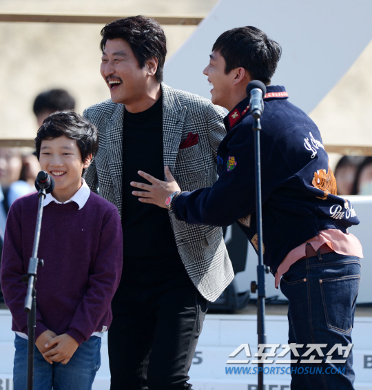 배우 송강호와 유아인, 아역배우 이효제가 3일 부산 해운대 비프빌리지에서 진행된 영화 '사도' 스페셜 무대인사에 참석해 인사말을 하고 있다. 송강호, 유아인 주연의 영화 '사도'는 어떤 순간에도 왕이어야 했던 아버지 영조와 단 한 순간이라도 아들이고 싶었던 세자 사도의 역사에 기록된 가장 비극적인 가족사를 그린 작품이다. 올해로 20주년을 맞는 부산국제영화제는 월드 프리미어 94편, 인터내셔널 프리미어 27편, 뉴 커런츠 부문 12편의 영화가 선보이며 10월 1일부터 10일까지 부산 영화의 전당을 비롯해 부산 일대 극장에서 열린다. 부산=허상욱 기자 wook@sportschosun.com/2015.10.03/ |