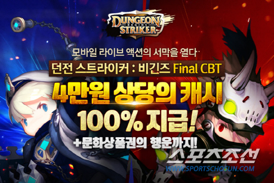 CBT에서는 지난 1차 CBT에서 나온 유저들의 의견을 기반으로, 개인별로 부여되는 독특한 돌발 퀘스트를 비롯한 컨텐츠 확충 및 편의성, 밸런스, 가이드, 안정성 등이 개선된 '던전스트라이커:BEGINS'를 만날 수 있다. 더불어 CBT 기간 동안 10, 20, 30레벨을 달성한 유저를 대상으로, 정식 서비스 때 각각 5000원, 1만5000원, 2만원의 쿠폰을 제공하며, 해당 미션을 모두 완료할 경우 추가로 4만원의 쿠폰을 지급할 예정이다. 또 기간 내 40레벨을 달성한 유저 중 추첨을 통해 100명에게 문화상품권(1만원)을 제공한다. 또 CBT 기간 내 설문 조사를 완료한 유저 중 무작위로 선정된 100명에게 역시 문화상품권(1만원)을 지급한다.