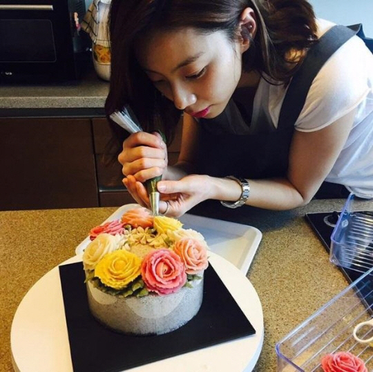 공개된 사진에서 박수진은 결혼 이후 더욱 청순해진 미모를 자랑한다. 박수진은 케이크에 꽃무늬 장식을 만들기 위해 집중하고 있다.