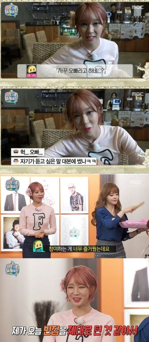 AOA 초아가 MBC '마이 리틀 텔레비전' 1위를 차지했다. 10일 방송된 '마이 리틀 텔레비전'에서는 김구라 오세득 황재근 차홍 초아가 1인 방송을 꾸렸다. 이날 초아는 모르모트PD와의 가상 연애 콘셉트를 선택했다. 그는 모르모트PD에게 "오빠"라고 부르며 갖은 애교를 선보였다. 남심 녹이는 초아의 애교 퍼레이드에도 모르모트PD는 무뚝뚝한 태도로 일관해 웃음을 안겼다. 결국 초아는 최종 우승을 차지했고 "즐거웠다. 빈집을 제대로 턴 것 같아 기쁘다"고 밝혔다.
