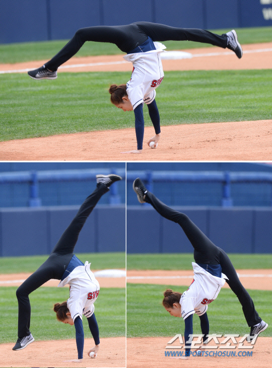 시구하는 신수지, 화끈한 '720도 회전' 시구…선수들 '깜짝'