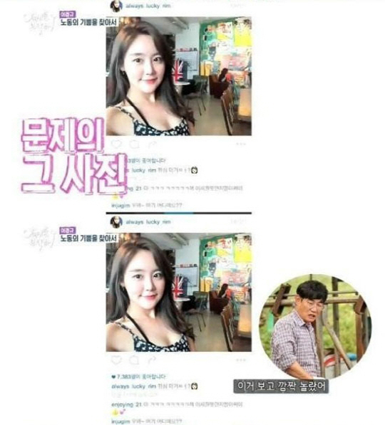 이에 예림은 민망해 하며 "몸의 1/3도 노출이 된 것이 아닌데 왜 그러느냐"고 말했고, 이경규는 "그 사진 보고 깜짝 놀랐다. 사진 찍을 때는 좋았지. 항상 겸손해야 한다"고 불만을 드러내 웃음을 자아냈다. <스포츠조선닷컴>