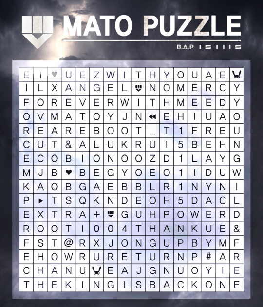 12일 오전 11시 15분 B.A.P의 공식 SNS를 통해 공개된 'MATO PUZZLE(마토 퍼즐)'에는 일종의 메시지를 암시하는 듯한 알파벳이 빼곡하게 나열되어 있다. 더욱이 '마토 퍼즐'이 공개된 오전 11시 15분은 앞서 B.A.P가 예고한 컴백날짜와도 일치해 팬들의 궁금증은 더욱 증폭되고 있는 상황이다.