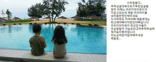 그는 "누가 뭐래도 지아 아빠 애들에게는 최고의 아빠이자 멋진 아빠입니다"라며 "우리 지아 지욱이 학교 친구들이 무슨 말 할까 가슴 조리고 하루하루 살며 제 가슴이 찢어집니다"라고 털어놨다. 이어 "더는 상처 받지 않게 해주세요. 제발요"라고 덧붙였다.