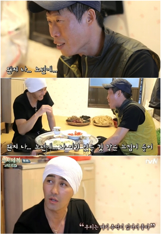 차승원은 텃밭과 부엌을 오가며 배춧국에 메추리알 장조림, 배추 겉절이까지 소박하지만 맛깔나는 음식들을 차려냈다. 밥상을 차리던 차승원은 "그저 자식 잘 됐으면 하는 바람이지. 우리 (손)호준이가 잘 돼야지. 근데 기술을 배우라니까 연기를 배웠어"라며 상황극을 시작했고, "그래도 곧잘 하는 모양. 어디가서 인정받으면 좋지"라며 말을 받는 유해진의 모습이 웃음을 자아냈다.
