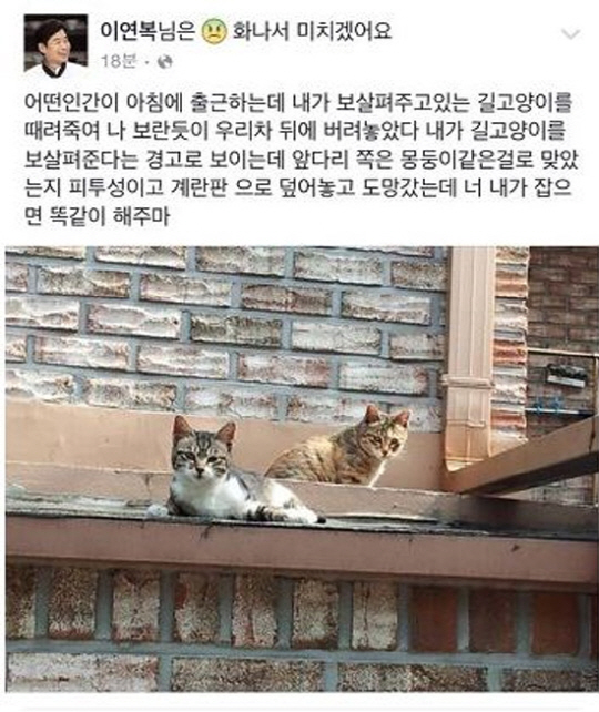 이어 "내가 길고양이를 보살펴준다는 경고로 보이는데 앞다리 쪽은 몽둥이 같은 걸로 맞았는지 피투성이고 계란 판으로 덮어놓고 도망갔는데 너 내가 잡으면 똑같이 해주마"라는 글과 함께 자신이 돌봐주던 고양이 두 마리의 모습이 담긴 사진을 게재했다.