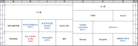 '학교 다녀오겠습니다'는 10월 20일부터 밤 9시 30분에 방송된다. 10월 28일부터는 '내친구집'이 수요일 밤 9시 30분, 이어서 '유자식 상팔자'가 10시 50분에 방송된다.