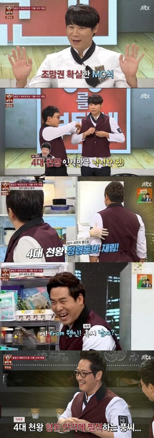 12일 방송된 JTBC '냉장고를 부탁해'에서는 폐렴으로 인해 녹화에 참석하지 못한 MC정형돈의 빈자리를 셰프 군단들이 돌아가면서 매우는 모습이 그려졌다. MC정형돈의 짝꿍 예능인보다 더 한 예능감으로 각종 프로그램을 종횡무진하는 셰프들이 고군분투했지만, 정형돈의 빈자리까지 메울 순 없었다.