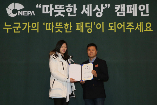 이어서 네파 박창근 대표이사는 젊은 시절 보육원 봉사를 통해 가정이 없는 아이들에게 따뜻한 집이 되어 주겠다고 다짐한 후, 두 명의 아이를 낳고 다섯 명의 아이를 입양해 키우고 있는 '아이들의 희망천사' 김순임-최영두 부부에게 패딩과 감사패를 전했다.