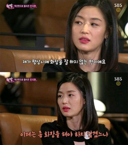 특히 전지현은 평상시 메이크업 습관에 대해 이야기를 꺼내 관심을 모았다. 그는 "평상시에 화장을 잘 하지 않는 편"이라며 "늘 우리 신랑이 하는 말이 있는데 이제는 좀 화장을 해야 하지 않겠냐고 잔소리했다"고 토로했다.