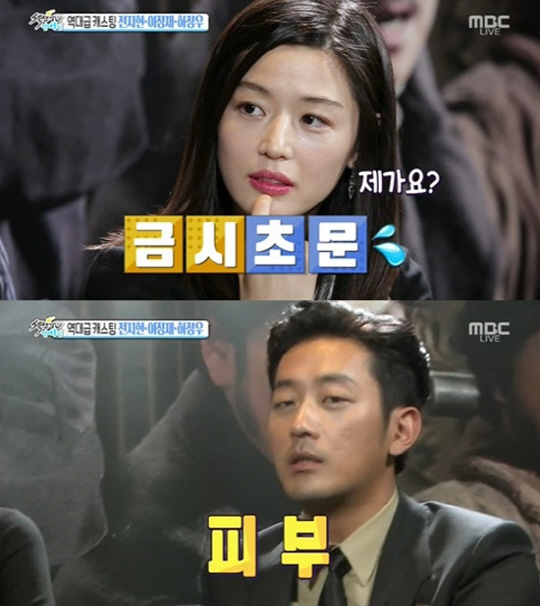 이에 하정우는 "이런 피부 갖기 힘들다"고 너스레를 떤 뒤 "전지현에게 알코올을 거부하는 간을 훔치고 싶다"고 말해 전지현을 폭소케 했다.