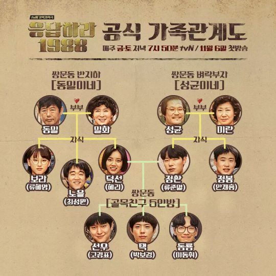 tvN '응답하라 1988' 측은 10월 15일 공식 페이스북에 "쌍문동 벼락부자 '성균이네'를 소개합니다!"는 글과 함께 공식 가족관계도를 공개했다.