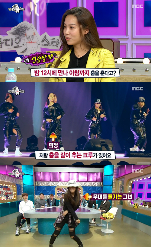 이날 MC들은 "김희정이 걸스힙합 크루 활동을 한다더라. 춤을 굉장히 좋아해서 밤 12시에 만나 아침까지 춤을 춘다고 하더라"고 운을 뗐다.