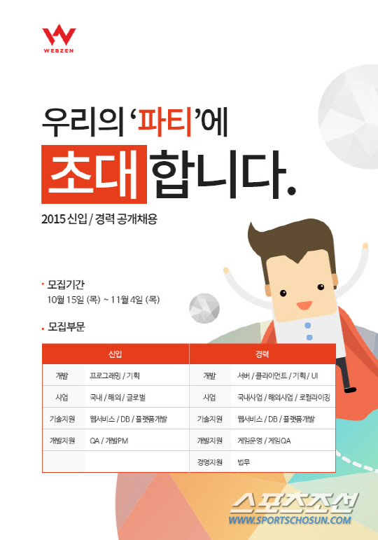 웹젠은 15일부터 11월 4일까지 3주간, '우리의 파티에 초대합니다'를 이번 공채 슬로건으로 내세우며, 글로벌 게임전문 기업을 지향하는 자사의 미래 가치를 함께하고, 게임 산업에 대한 관심과 실무능력을 갖춘 인재를 선발할 예정이다.