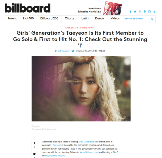 미국 음악 전문 매체 빌보드는 지난 14일(현지시각) K-POP 칼럼코너 'K-TOWN'을 통해 "Girls' Generation's Taeyeon Is Its First Member to Go Solo & First to Hit No. 1: Check Out the Stunning 'I'(소녀시대 멤버 중 처음 솔로로 나선 태연, 1위까지 차지하다 : 멋진 'I'를 주목하라)"는 제목의 기사를 게재, 태연의 솔로 앨범 'I'를 자세히 설명해 눈길을 끈다.