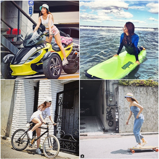 운동을 좋아한다는 김희정의 인스타그램 사진 속에는 바이크 뿐 아니라 서핑, 스케이드 보드, 자전거 등 다양한 액티비티를 즐기는 모습이 눈길을 모은다. 스타일리시한 스포티룩에 야외 활동을 즐기는 김희정의 모습은 당당하고 건강미 넘친다.