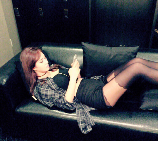 공개된 사진에서 유리는 소파에 누워 핸드폰을 보고 있다. 위아래로 아찔하게 짧은 의상과 가터벨트 스타킹이 눈에 띈다.